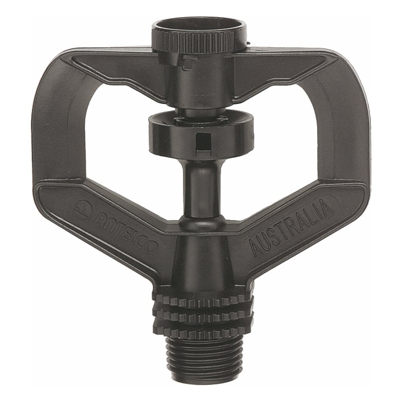 Antelco ROTOR MAX 1/2″ BSPM 3.8mm PURPLE NOZZLE.Robust and reliable “spinner” sprinkler for use above and below plant foliage and with two trajectory options. Excellent Sprinkler Distribution patterns and performance. Features Dual outlet spinner enhances performance. Standard model has a 25° trajectory, black coloured spinner. Inverted model has a 0° flat trajectory, khaki coloured spinner. Suitable for recycled water applications subject to adequate filtration. Easily taken apart for servicing. UV stabilised materials for long life. Applications Greenhouses, vegetable row crops and under tree watering. Inverted Rotor Max is ideal for over-head watering in glasshouse, nursery and shade house applications. The 0° trajectory sprinkler is also suited to standard upright operation, excellent for under foliage or wind affected locations.