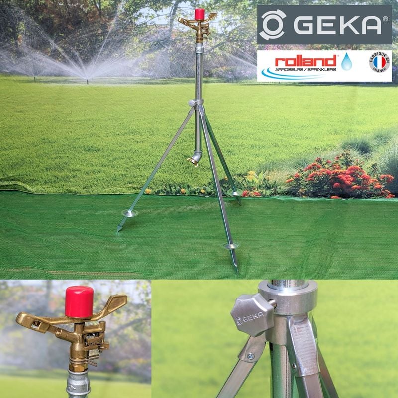 Rolland 17S Brass impact sprinkler mounted on Galvanised metal Tripod with steel riser and spiked legs